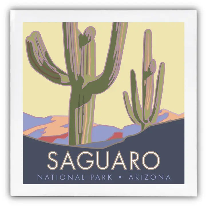 Two lone saguaros stand amidst pastel hills set in this original design of Saguaro National Park.